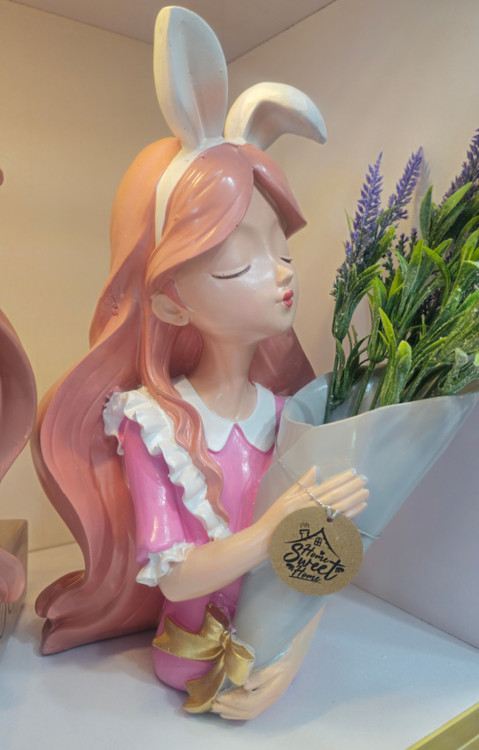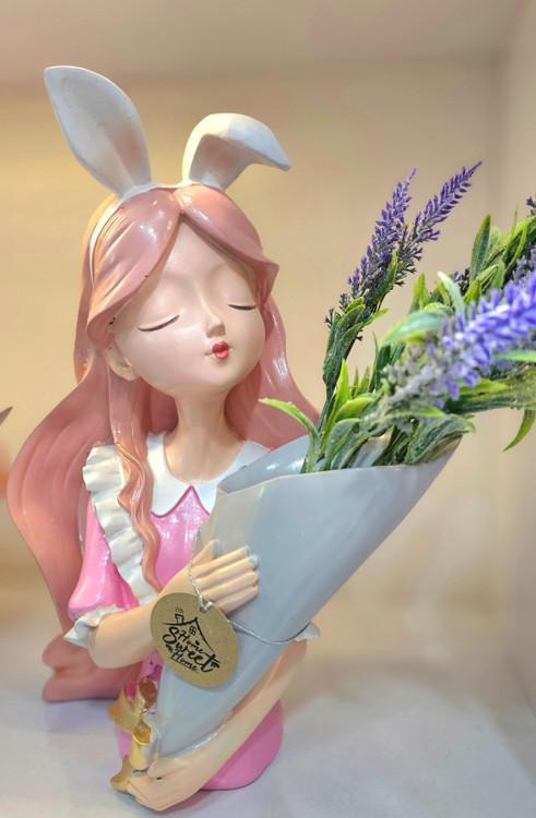 مجسمه دختر فانتزی خرگوشی صورتی گلدان به دست